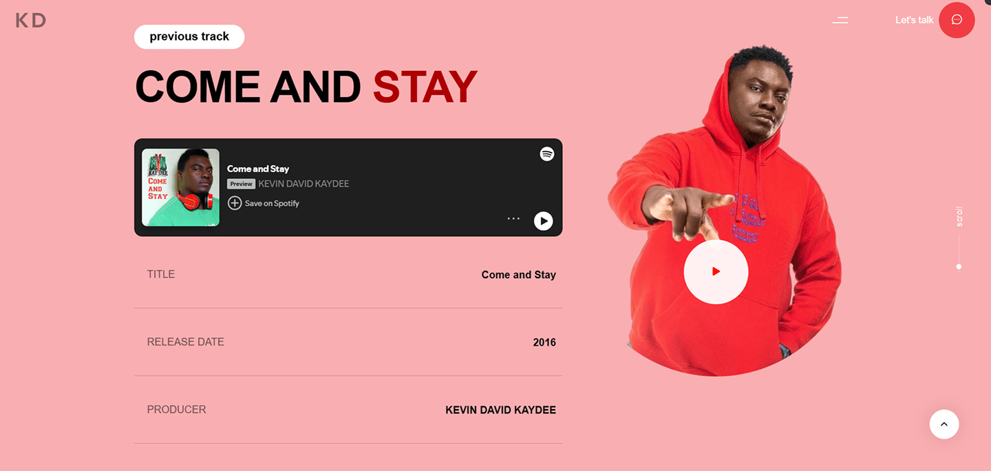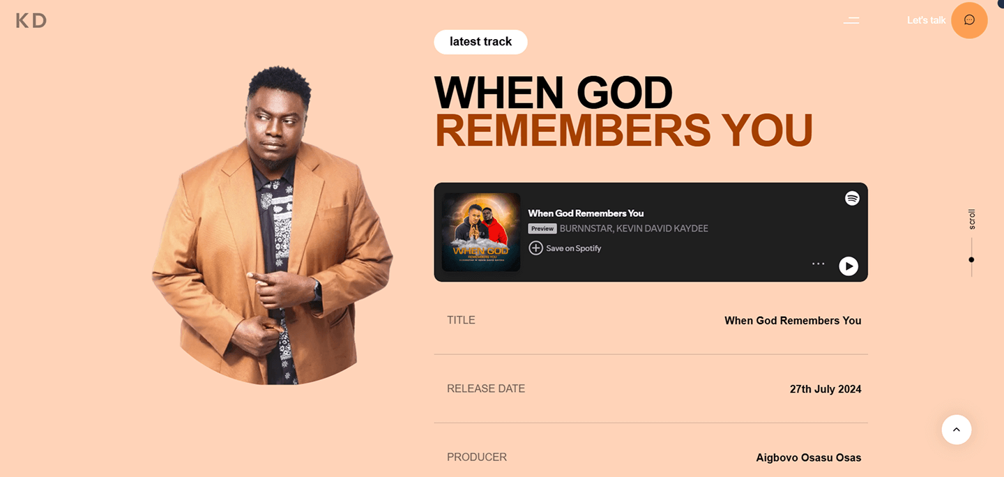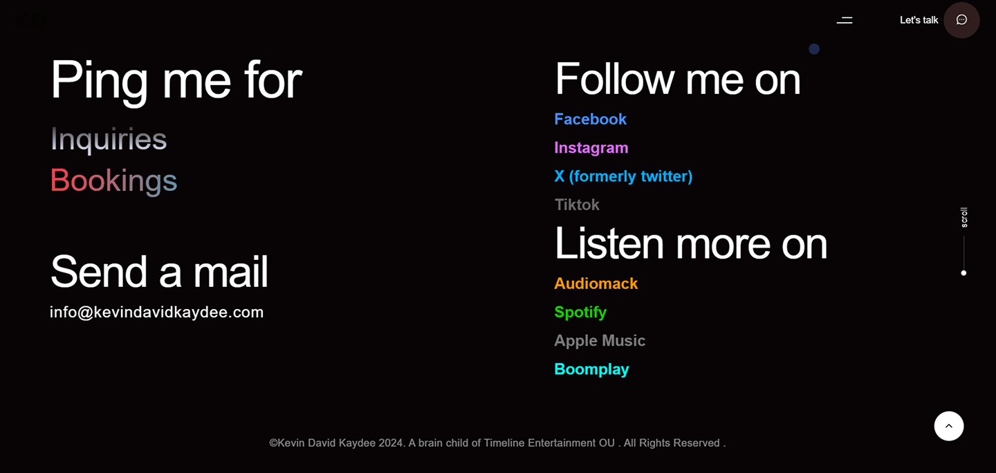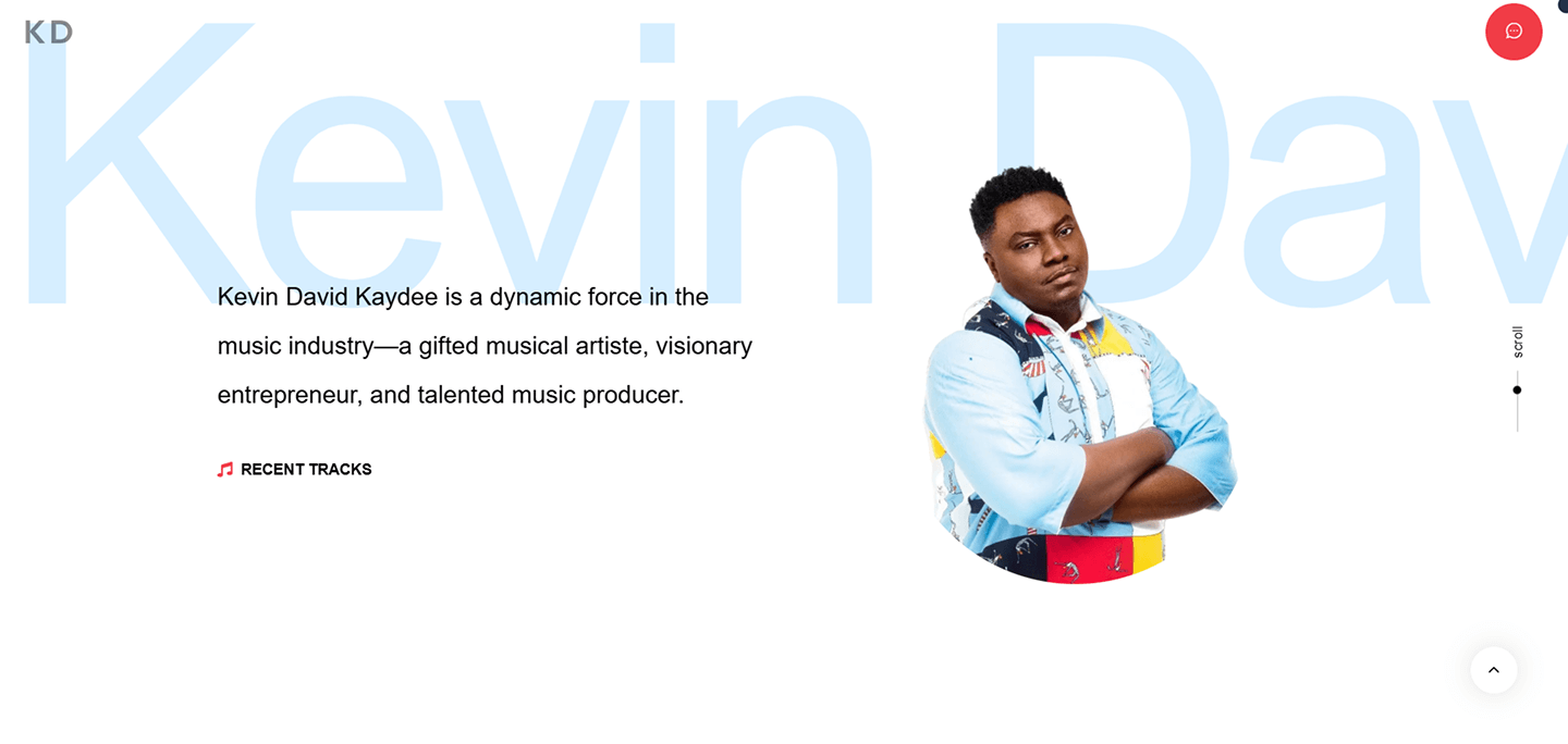 Previous Kevin David Kaydee A personal profile one page website for entertainment and media and publicity. Category EntertainmentRole Web Developer & Product DesignerYear 2024Deliverables Web Development & UI/UX Previous